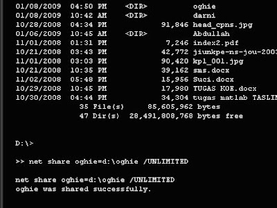 net share namafolder=d:\lokasifolder /UNLIMITED kemudian enter. Lihat gambar dibawah ini: